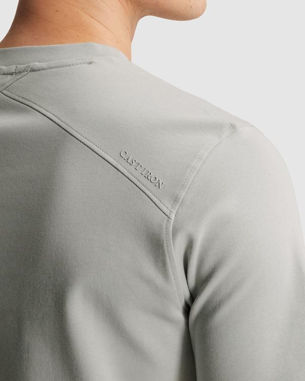 Dit lichtgrijze T-shirt van Cast Iron heeft een clean ontwerp met een ronde hals en korte mouwen. Op de borst zit een subtiel geborduurd logo in tone-on-tone, en op de mouw valt een klein metalen accent op. De raglan naden aan de achterzijde geven het shirt een eigenzinnige twist die past bij het karakter van het merk.