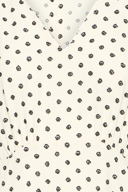 Deze luchtige jurk van Ichi heeft een frisse witte kleur met een speels stippendessin in donkergroen. De jurk valt tot midi lengte en heeft een flatterende V-hals die zorgt voor een vrouwelijk silhouet. De korte fluttermouwen geven de jurk een luchtig en bewegelijk effect. Aan de taille zit een elastische band die voor een mooie getailleerde pasvorm zorgt, terwijl de rok wijd uitloopt. Het materiaal is 100% polyester, waardoor de stof licht aanvoelt en kreukbestendig is. Een fijne jurk uit de dames kleding collectie van Ichi die je met gemak van lente tot zomer draagt.