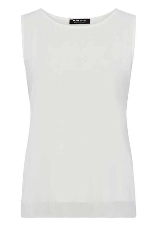 De Frank Walder Blouse S61-601151000 is een mouwloze top in een off white kleur van het merk Frank Walder. De top heeft een ronde hals en een effen uitstraling. Op de foto is een gladde voorkant te zien met een nette, rechte onderzijde. De stof is 100% polyester, waardoor de top licht aanvoelt, vormvast is en snel droogt na het wassen.