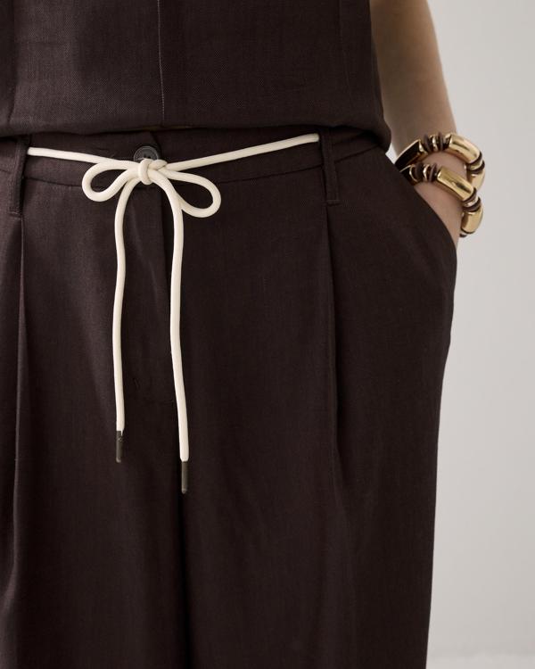 Deze donkerbruine broek van Summum heeft een wijde pijp en een relaxte pasvorm dankzij de trekkoord sluiting in een contrasterend crèmewit. Plooien aan de voorzijde geven de broek een verzorgde uitstraling. De mix van linnen, polyester, viscose en elastaan zorgt voor een luchtig draagcomfort met voldoende bewegingsvrijheid. Een eigenzinnig ontwerp dat verfijning combineert met een comfortabele fit.