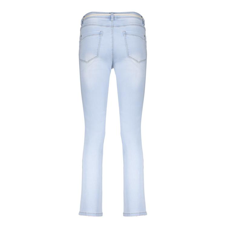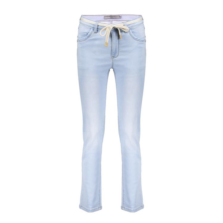 Deze lichtblauwe jeans van Geisha heeft een frisse, zomerse uitstraling. Het model FLOOR valt recht met een enkellange pijp en zit comfortabel dankzij de katoenmix met een vleugje stretch. Opvallend detail is het decoratieve koord aan de taille, dat een speels accent geeft aan de denim look. De jeans heeft steekzakken aan de voorzijde en opgezette zakken aan de achterzijde. De lichte wassing geeft deze broek een luchtig en eigentijds karakter.