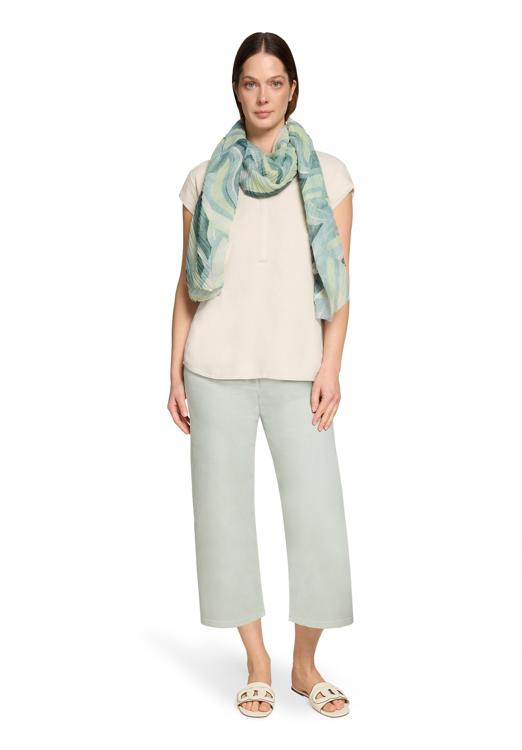 Deze lichte sjaal van Betty Barclay valt op door het sierlijke golfpatroon in verschillende groentinten. De zachte polyester stof voelt aangenaam aan op de huid en heeft een licht gekreukte textuur die de sjaal een natuurlijke, soepele val geeft. De kleurcombinatie van mintgroen, jadegroen en zachtgeel maakt dit accessoire veelzijdig en vrouwelijk.