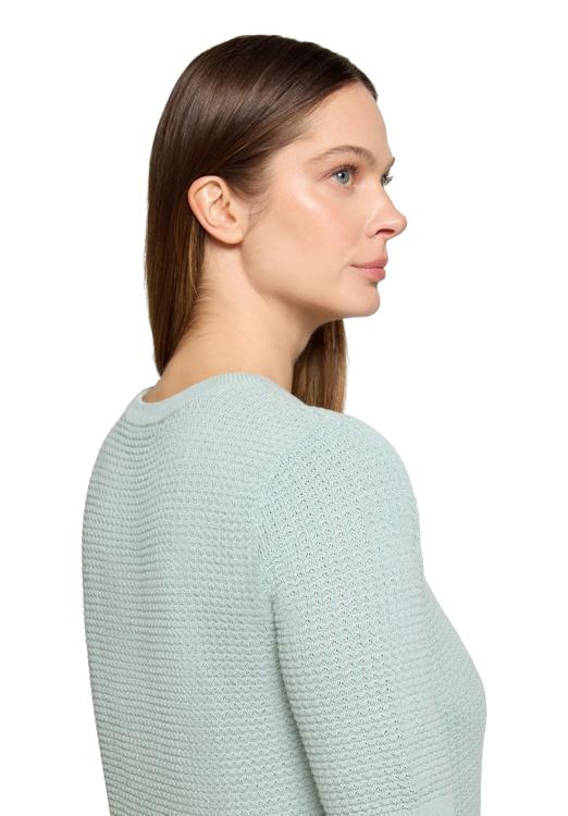 Deze gebreide sweater van Betty Barclay heeft een zachte mintgroene kleur en valt op door het fijne, open breipatroon. De halflange mouwen en ronde hals geven het ontwerp een verfijnde uitstraling. Het katoen voelt aangenaam aan op de huid en biedt een luchtig draagcomfort, ook op warmere dagen. De relaxte pasvorm zorgt ervoor dat deze trui vrouwelijk valt zonder strak te zitten.