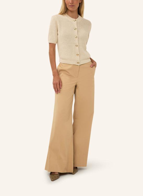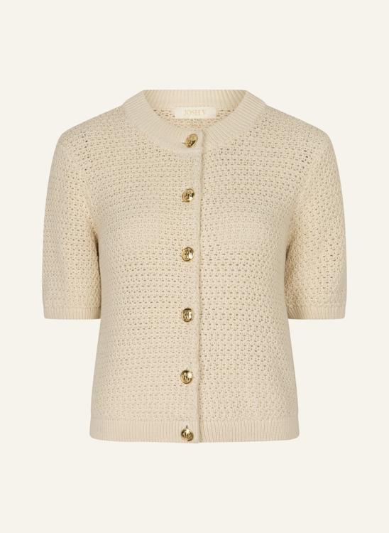 Dit ecrukleurige vest van het merk Josh V heeft een opengewerkte breistructuur. Het kledingstuk is uitgevoerd met korte mouwen en een ronde halslijn. Aan de voorzijde zitten goudkleurige knopen met een logo detail die als sluiting dienen. Het gebruik van katoen zorgt voor een ademend effect en voelt zacht aan op je huid als je het draagt.