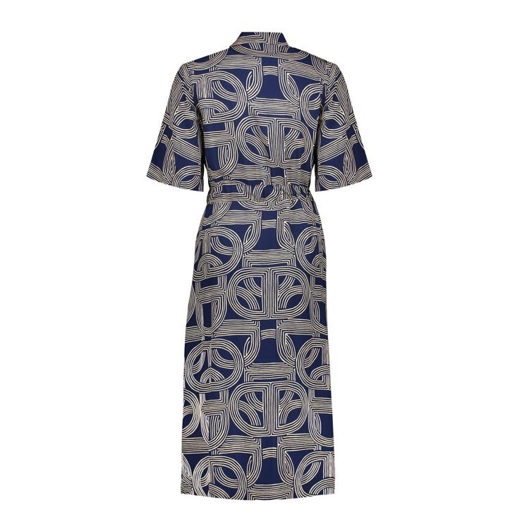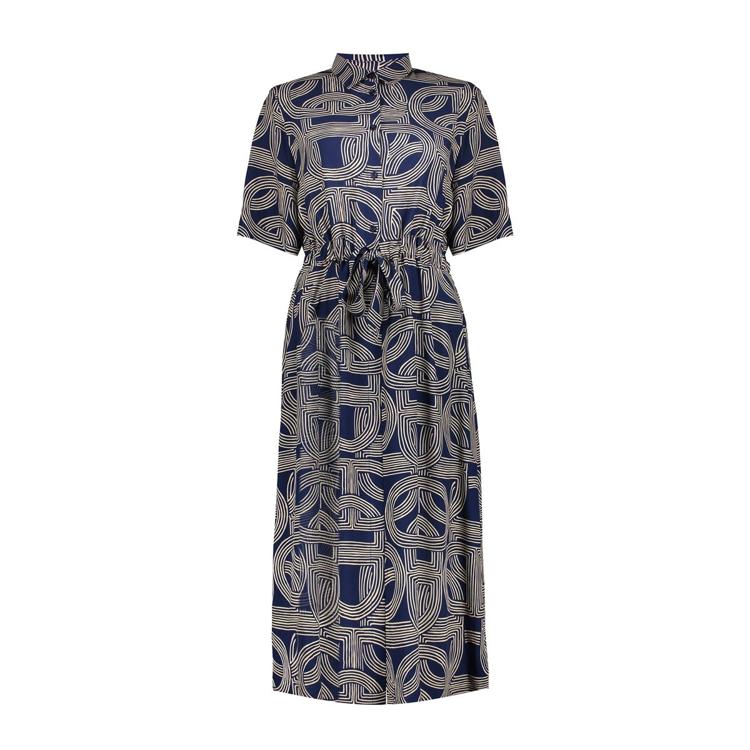 Deze midi-jurk van Geisha heeft een opvallende grafische print in blauw en beige. De jurk heeft korte mouwen, een kraag en een knoopsluiting aan de voorzijde. Een strikceintuur in de taille geeft je figuur mooi vorm. De splitdetail aan de onderzijde zorgt voor bewegingsvrijheid. Het materiaal van 100% viscose voelt zacht aan op de huid en draagt luchtig, ook op warmere dagen.